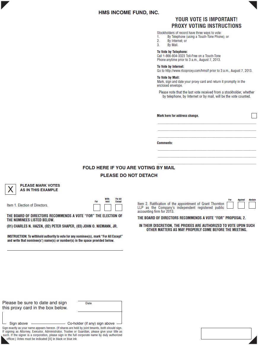 HMS INCOME FUND, INC. YOUR VOTE IS IMPORTANT! PROXY VOTING INSTRUCTIONS Stockholders of record have three ways to vote: 1. By Telephone (using a Touch-Tone Phone); or 2. By Internet; or 3. By Mail. To Vote by Telephone: Call 1-866-804-3323 Toll-Free on a Touch-Tone Phone anytime prior to 3 a.m., August 7, 2013. To Vote by Internet: Go to http://www.rtcoproxy.com/hmsif prior to 3 a.m., August 7, 2013. To Vote by Mail: Mark, sign and date your proxy card and return it promptly in the enclosed envelope. Please note that the last vote received from a stockholder, whether by telephone, by Internet or by mail, will be the vote counted. With- For All For hold Except For Against Abstain Date Sign above Co-holder (if any) sign above Please be sure to date and sign this proxy card in the box below. Sign exactly as your name appears hereon. (If shares are held by joint tenants, both should sign. If signing as Attorney, Executor, Administrator, Trustee or Guardian, please give your title as such. If the signer is a corporation, please sign in the full corporate name by duly authorized officer.) Votes must be indicated [X] in black or blue ink Item 1. Election of Directors. THE BOARD OF DIRECTORS RECOMMENDS A VOTE “FOR” THE ELECTION OF THE NOMINEES LISTED BELOW. (01) CHARLES N. HAZEN, (02) PETER SHAPER, (03) JOHN O. NIEMANN, JR. INSTRUCTION: To withhold authority to vote for any nominee(s), mark “For All Except” and write that nominee(s’) name(s) or number(s) in the space provided below. Mark here for address change. __________________________________________________________ __________________________________________________________ __________________________________________________________ Comments: __________________________________________________________ __________________________________________________________ __________________________________________________________ FOLD HERE IF YOU ARE VOTING BY MAIL PLEASE DO NOT DETACH Item 2. Ratification of the appointment of Grant Thornton LLP as the Company’s independent registered public accounting firm for 2013. THE BOARD OF DIRECTORS RECOMMENDS A VOTE “FOR” PROPOSAL 2. IN THEIR DISCRETION, THE PROXIES ARE AUTHORIZED TO VOTE UPON SUCH OTHER MATTERS AS MAY PROPERLY COME BEFORE THE MEETING