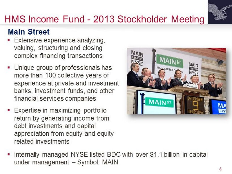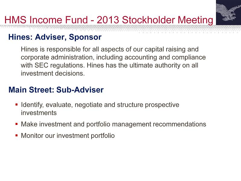 HMS Income Fund - 2013 Stockholder Meeting Hines: Adviser, Sponsor Hines is responsible for all aspects of our capital raising and corporate administration, including accounting and compliance with SEC regulations. Hines has the ultimate authority on all investment decisions. Main Street: Sub - Adviser ▪ Identify, evaluate, negotiate and structure prospective investments ▪ Make investment and portfolio management recommendations ▪ Monitor our investment portfolio