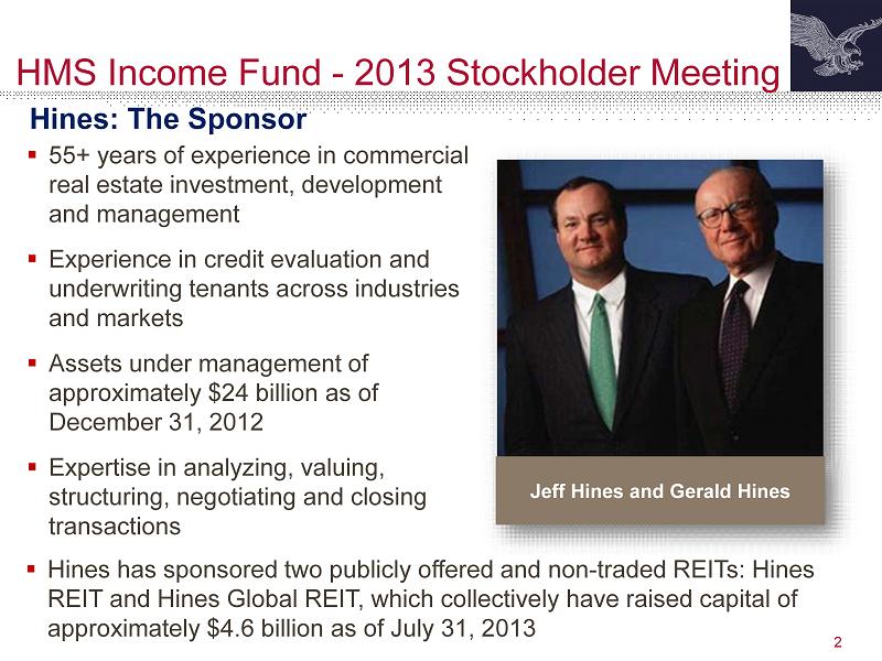 HMS Income Fund - 2013 Stockholder Meeting Hines: The Sponsor ▪ 55+ years of experience in commercial real estate investment, development and management ▪ Experience in credit evaluation and underwriting tenants across industries and markets ▪ Assets under management of approximately $24 billion as of December 31, 2012 ▪ Expertise in analyzing, valuing, structuring, negotiating and closing transactions Jeff Hines and Gerald Hines 2 ▪ Hines has sponsored two publicly offered and non - traded REITs: Hines REIT and Hines Global REIT, which collectively have raised capital of approximately $4.6 billion as of July 31, 2013