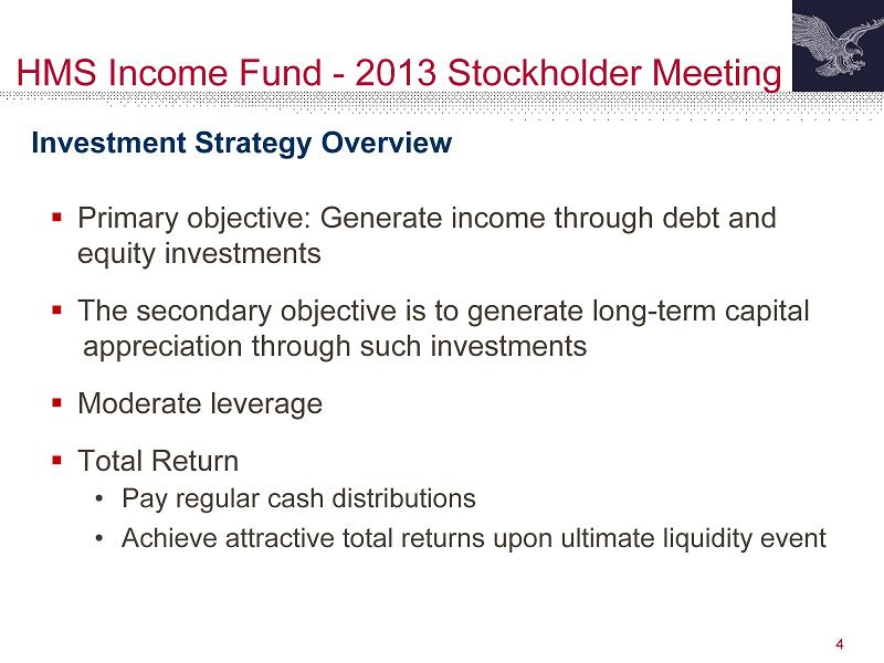 HMS Income Fund - 2013 Stockholder Meeting Main Street 3 ▪ Extensive experience analyzing, valuing, structuring and closing complex financing transactions ▪ Unique group of professionals has more than 100 collective years of experience at private and investment banks, investment funds, and other financial services companies ▪ Expertise in maximizing portfolio return by generating income from debt investments and capital appreciation from equity and equity related investments ▪ Internally managed NYSE listed BDC with over $1.1 billion in capital under management -- Symbol: MAIN
