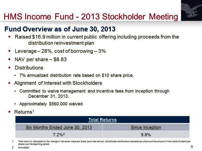 HMS Income Fund - 2013 Stockholder Meeting 4 Investment Strategy Overview ▪ Primary objective: Generate income through debt and equity investments ▪ The secondary objective is to generate long - term capital appreciation through such investments ▪ Moderate leverage ▪ Total Return • Pay regular cash distributions • Achieve attractive total returns upon ultimate liquidity event