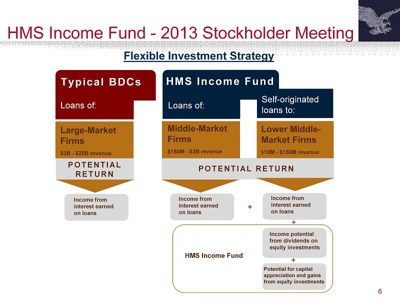 HMS Income Fund - 2013 Stockholder Meeting 5 ▪ Raised $16.9 million in current public offering including proceeds from the distribution reinvestment plan ▪ Leverage – 28 %, cost of borrowing – 3% ▪ NAV per share – $ 8.83 ▪ Distributions • 7 % annualized distribution rate based on $10 share price. ▪ Alignment of Interest with Stockholders • Committed to waive management and incentive fees from inception through December 31, 2013. • Approximately $560,000 waived ▪ Returns 1 1. Total return is calculated on the change in net asset value per share (post fee waiver), stockholder distributions declared per share and the amount of the stock dividend per share over the reporting period. 2. Annualized Fund Overview as of June 30, 2013 Total Returns Six Months Ended June 30, 2013 Since Inception 7.2% 2 9.8%