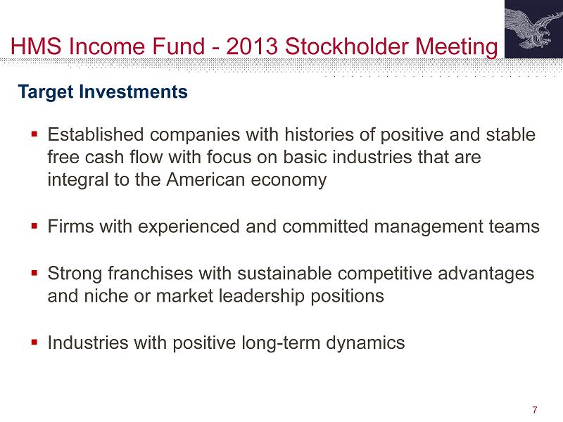 HMS Income Fund - 2013 Stockholder Meeting 6 Typical BDCs Loans of: Large - Market Firms $3B - $25B revenue POTENTIAL RETURN HMS Income Fund Loans of : Self - originated loans to: POTENTIAL RETURN Income from interest earned on loans Income from interest earned on loans Income potential from dividends on equity investments Potential for capital appreciation and gains from equity investments Middle - Market Firms $150M - $3B revenue Lower Middle - Market Firms $ 10M - $150M revenue + + + HMS Income Fund Income from interest earned on loans Flexible Investment Strategy