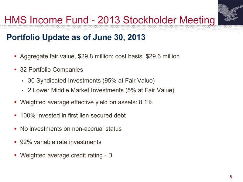 HMS Income Fund - 2013 Stockholder Meeting 7 ▪ Established companies with histories of positive and stable free cash flow with focus on basic industries that are integral to the American economy ▪ Firms with experienced and committed management teams ▪ Strong franchises with sustainable competitive advantages and niche or market leadership positions ▪ Industries with positive long - term dynamics Target Investments