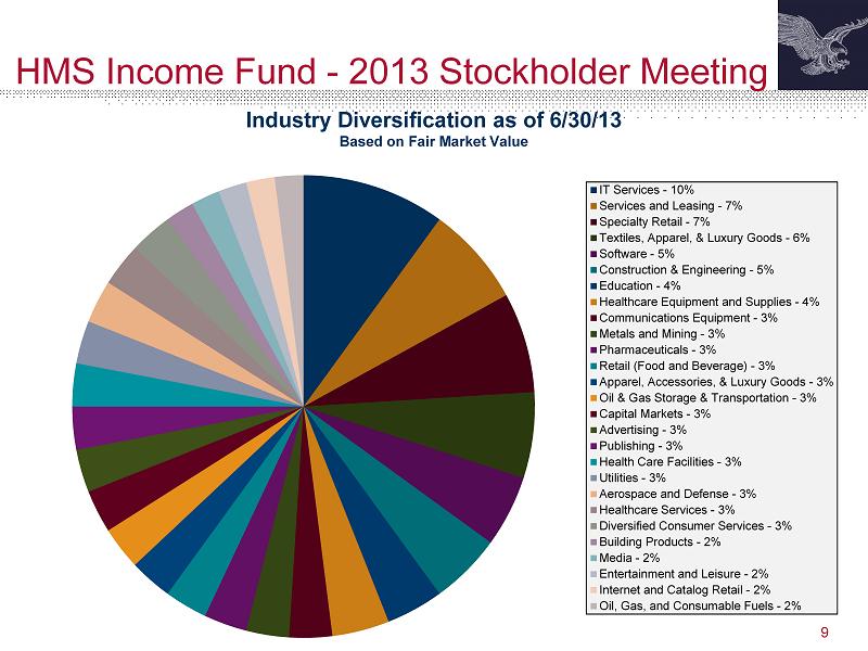HMS Income Fund - 2013 Stockholder Meeting 8 Portfolio Update as of June 30, 2013 ▪ Aggregate fair value, $29.8 million; cost basis, $29.6 million ▪ 32 Portfolio Companies • 30 Syndicated Investments (95% at Fair Value) • 2 Lower Middle Market Investments (5% at Fair Value) ▪ Weighted average effective yield on assets: 8.1% ▪ 100% invested in first lien secured debt ▪ No investments on non - accrual status ▪ 92% variable rate investments ▪ Weighted a verage c redit rating - B