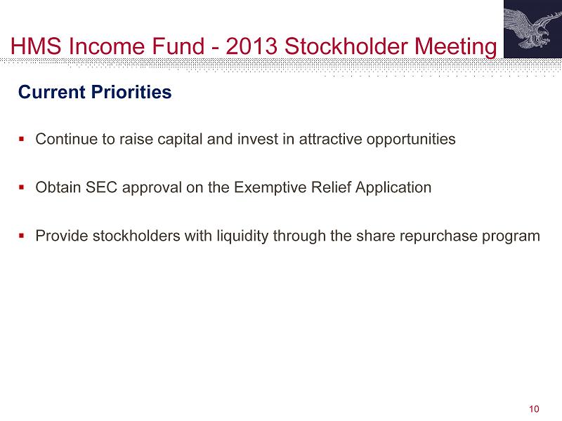 HMS Income Fund - 2013 Stockholder Meeting 9 IT Services - 10% Services and Leasing - 7% Specialty Retail - 7% Textiles, Apparel, & Luxury Goods - 6% Software - 5% Construction & Engineering - 5% Education - 4% Healthcare Equipment and Supplies - 4% Communications Equipment - 3% Metals and Mining - 3% Pharmaceuticals - 3% Retail (Food and Beverage) - 3% Apparel, Accessories, & Luxury Goods - 3% Oil & Gas Storage & Transportation - 3% Capital Markets - 3% Advertising - 3% Publishing - 3% Health Care Facilities - 3% Utilities - 3% Aerospace and Defense - 3% Healthcare Services - 3% Diversified Consumer Services - 3% Building Products - 2% Media - 2% Entertainment and Leisure - 2% Internet and Catalog Retail - 2% Oil, Gas, and Consumable Fuels - 2% Industry Diversification as of 6/30/13 Based on Fair Market Value
