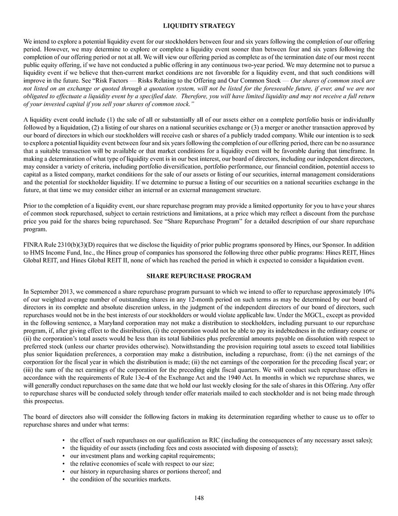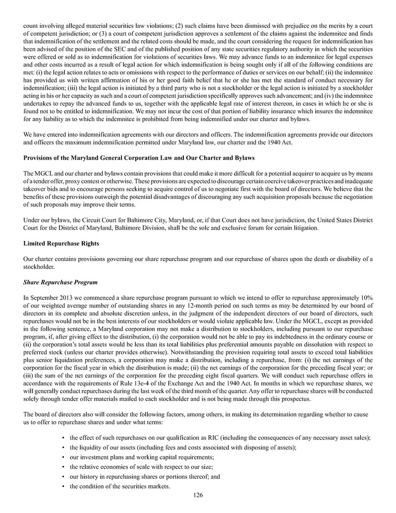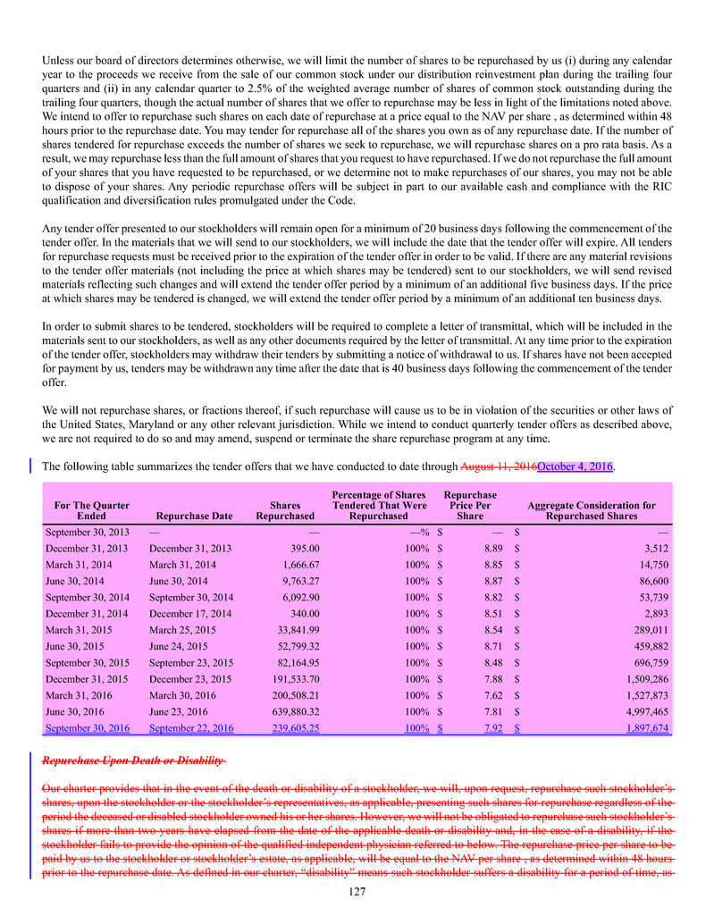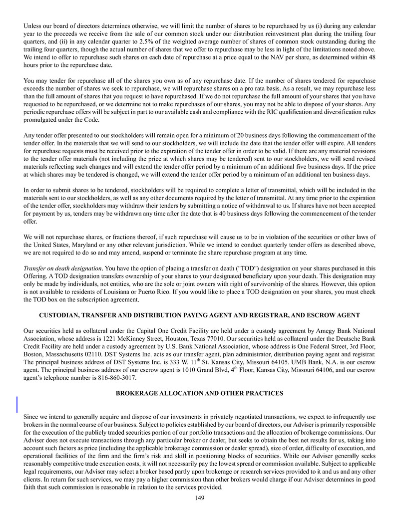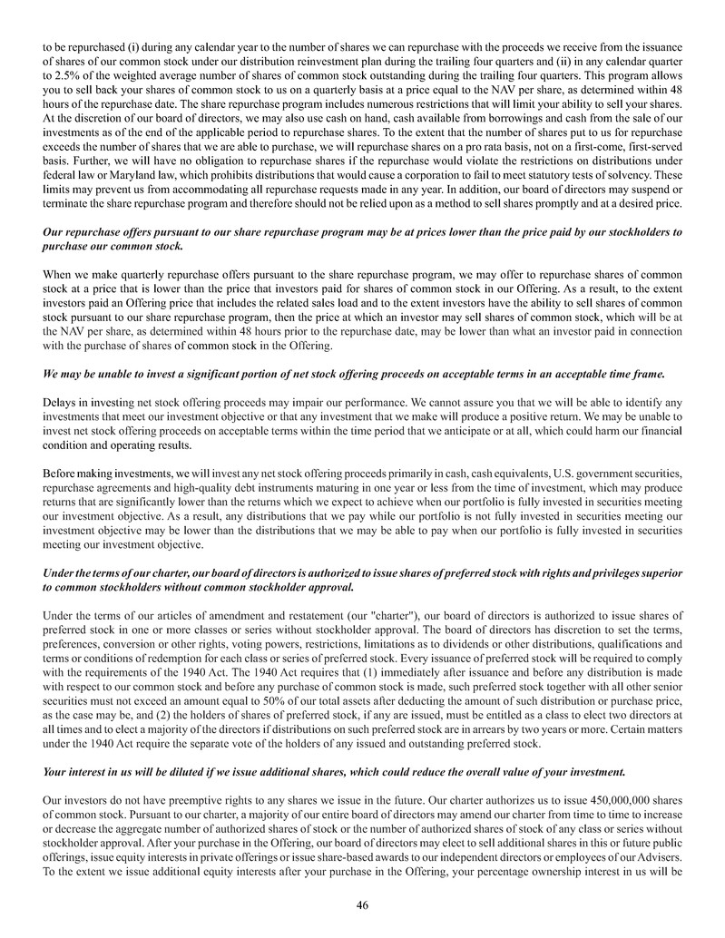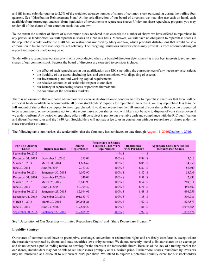 quarterly tender offers for our shares. Any tender offers will be made at a price equal to the NAV per share determined within 48 hours