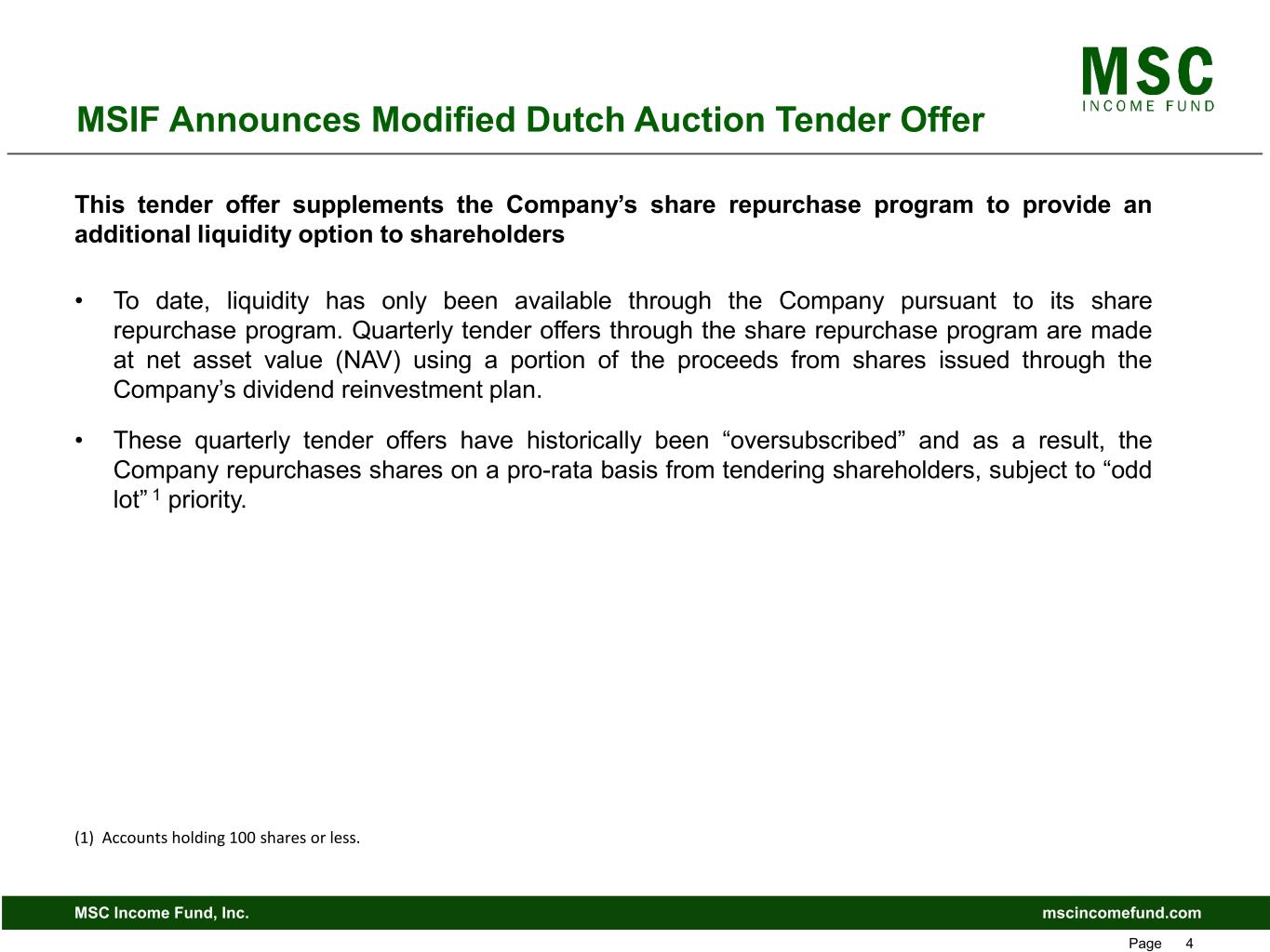mscincomefund.comMSC Income Fund, Inc. Page 3 MSIF Announces Modified Dutch Auction Tender Offer On May 15, 2023, the Company announced the commencement of a Modified Dutch Auction tender offer for an aggregate purchase price of not more than $2 million of shares of the Company’s common stock • This tender offer supplements the Company’s share repurchase program to provide an additional liquidity option to shareholders. See pages 4 - 5 for more information. • The tender offer is structured as a “Modified Dutch Auction”. See page 7 for more information. • Shares will be purchased at the lowest per share price at which the Company is able to purchase $2 million of shares of common stock. See page 6 for more information. • The Company will use all of the proceeds from the sale of $2 million of new shares of common stock to Main Street Capital Corporation to buy shares in the offer. See page 7 for more information. • Forms to participate in the tender are available on the Company’s website at www.mscincomefund.com/investors. • The offer will remain open until 5:00pm Central Time, June 13, 2023, unless extended or withdrawn. Documents should be submitted to the address below: Mail to: MSC Income Fund, Inc. | P.O. Box 219536 | Kansas City, MO 64121-9536 Overnight: MSC Income Fund, Inc. | 430 W. 7th St. Suite 219536 | Kansas City, MO 64105-1407
