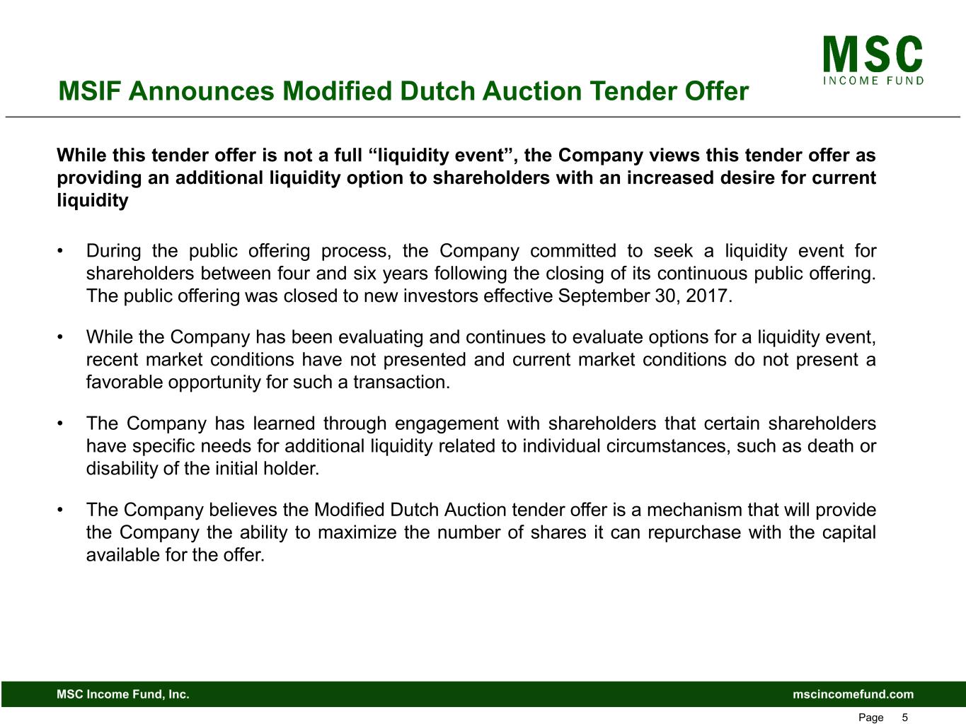 mscincomefund.comMSC Income Fund, Inc. Page 4 MSIF Announces Modified Dutch Auction Tender Offer This tender offer supplements the Company’s share repurchase program to provide an additional liquidity option to shareholders • To date, liquidity has only been available through the Company pursuant to its share repurchase program. Quarterly tender offers through the share repurchase program are made at net asset value (NAV) using a portion of the proceeds from shares issued through the Company’s dividend reinvestment plan. • These quarterly tender offers have historically been “oversubscribed” and as a result, the Company repurchases shares on a pro-rata basis from tendering shareholders, subject to “odd lot” 1 priority. (1) Accounts holding 100 shares or less.