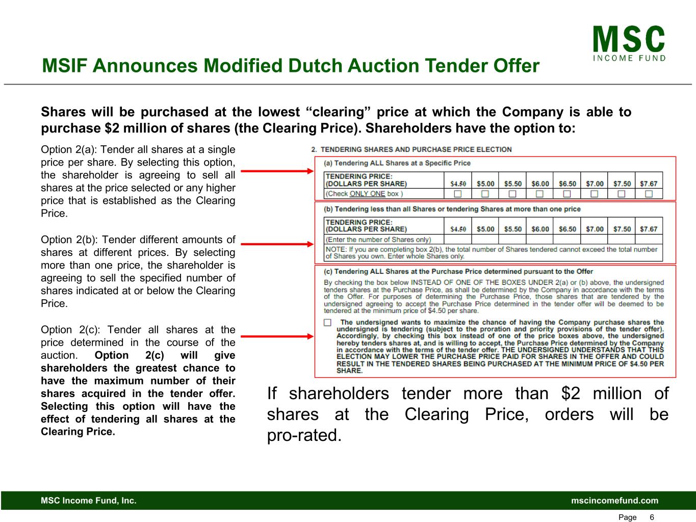 mscincomefund.comMSC Income Fund, Inc. Page 6 MSIF Announces Modified Dutch Auction Tender Offer Shares will be purchased at the lowest “clearing” price at which the Company is able to purchase $2 million of shares (the Clearing Price). Shareholders have the option to: Option 2(a): Tender all shares at a single price per share. By selecting this option, the shareholder is agreeing to sell all shares at the price selected or any higher price that is established as the Clearing Price. Option 2(b): Tender different amounts of shares at different prices. By selecting more than one price, the shareholder is agreeing to sell the specified number of shares indicated at or below the Clearing Price. Option 2(c): Tender all shares at the price determined in the course of the auction. Option 2(c) will give shareholders the greatest chance to have the maximum number of their shares acquired in the tender offer. Selecting this option will have the effect of tendering all shares at the Clearing Price. If shareholders tender more than $2 million of shares at the Clearing Price, orders will be pro-rated.