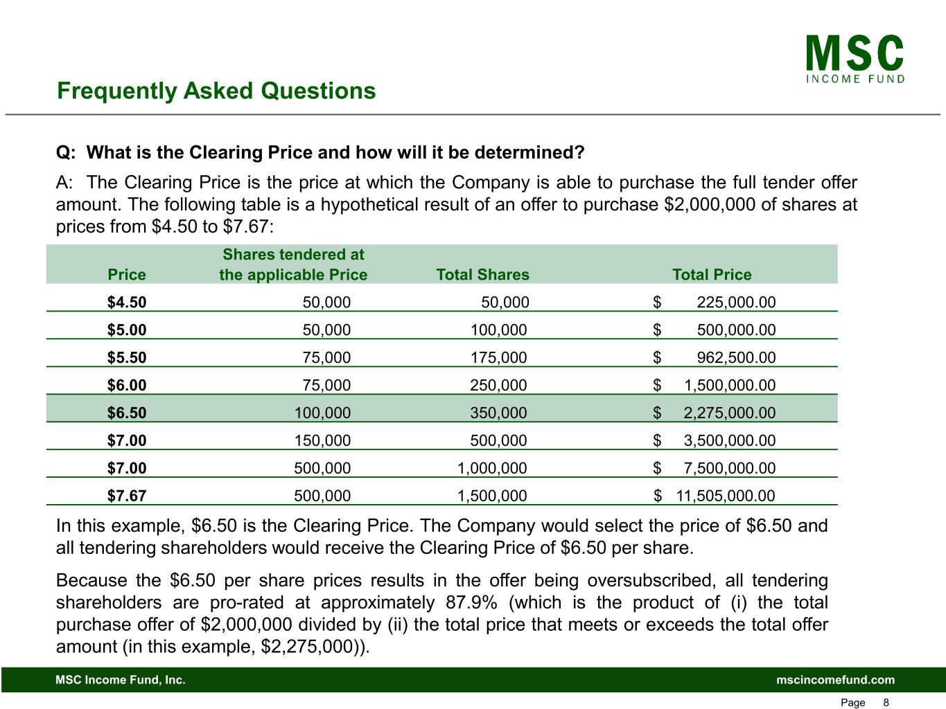 mscincomefund.comMSC Income Fund, Inc. Page 8 Price Shares tendered at the applicable Price Total Shares Total Price $4.50 50,000 50,000 $ 225,000.00 $5.00 50,000 100,000 $ 500,000.00 $5.50 75,000 175,000 $ 962,500.00 $6.00 75,000 250,000 $ 1,500,000.00 $6.50 100,000 350,000 $ 2,275,000.00 $7.00 150,000 500,000 $ 3,500,000.00 $7.00 500,000 1,000,000 $ 7,500,000.00 $7.67 500,000 1,500,000 $ 11,505,000.00 Frequently Asked Questions Q: What is the Clearing Price and how will it be determined? A: The Clearing Price is the price at which the Company is able to purchase the full tender offer amount. The following table is a hypothetical result of an offer to purchase $2,000,000 of shares at prices from $4.50 to $7.67: In this example, $6.50 is the Clearing Price. The Company would select the price of $6.50 and all tendering shareholders would receive the Clearing Price of $6.50 per share. Because the $6.50 per share prices results in the offer being oversubscribed, all tendering shareholders are pro-rated at approximately 87.9% (which is the product of (i) the total purchase offer of $2,000,000 divided by (ii) the total price that meets or exceeds the total offer amount (in this example, $2,275,000)).