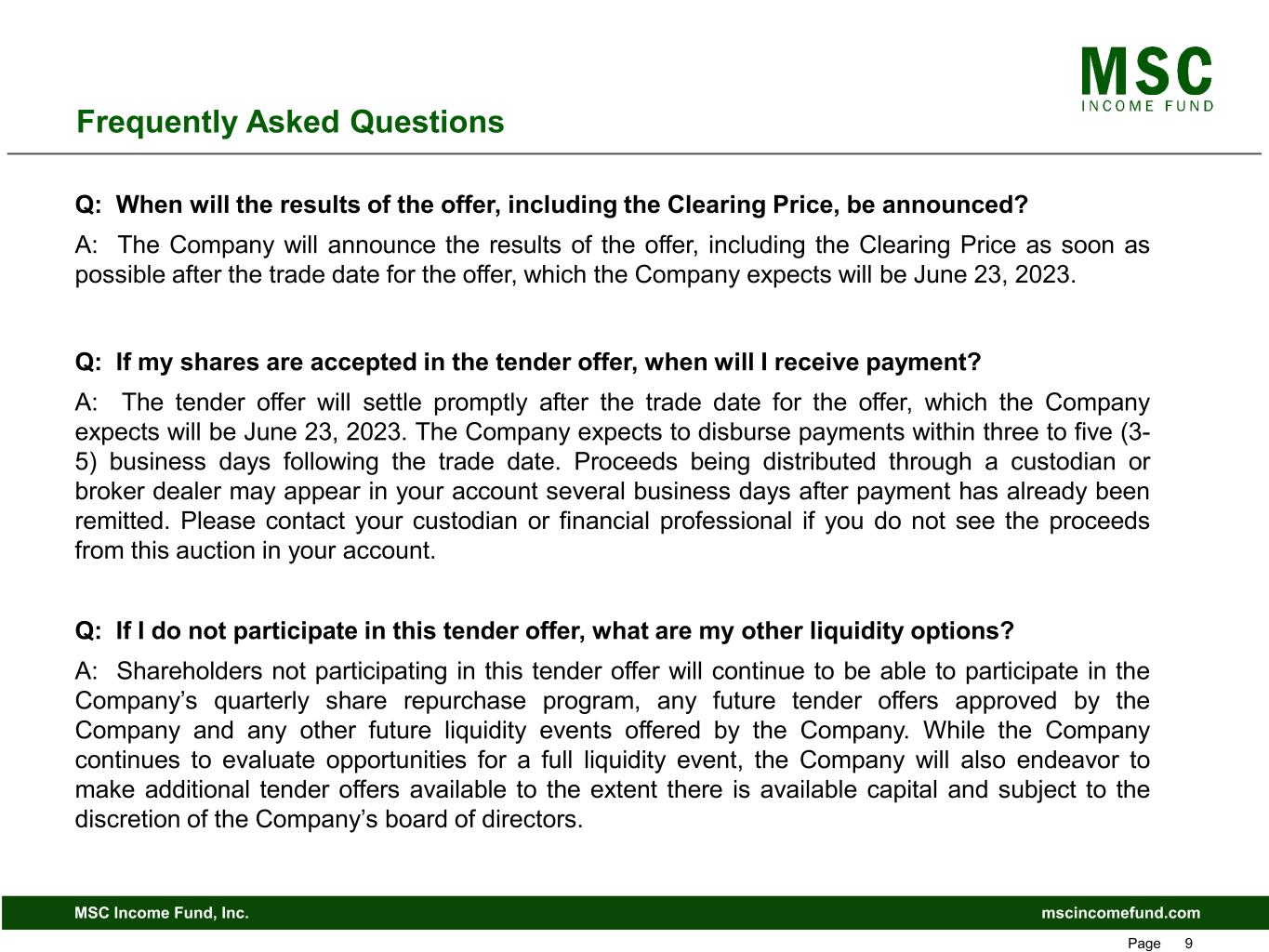 mscincomefund.comMSC Income Fund, Inc. Page 9 Frequently Asked Questions Q: When will the results of the offer, including the Clearing Price, be announced? A: The Company will announce the results of the offer, including the Clearing Price as soon as possible after the trade date for the offer, which the Company expects will be June 23, 2023. Q: If my shares are accepted in the tender offer, when will I receive payment? A: The tender offer will settle promptly after the trade date for the offer, which the Company expects will be June 23, 2023. The Company expects to disburse payments within three to five (3- 5) business days following the trade date. Proceeds being distributed through a custodian or broker dealer may appear in your account several business days after payment has already been remitted. Please contact your custodian or financial professional if you do not see the proceeds from this auction in your account. Q: If I do not participate in this tender offer, what are my other liquidity options? A: Shareholders not participating in this tender offer will continue to be able to participate in the Company’s quarterly share repurchase program, any future tender offers approved by the Company and any other future liquidity events offered by the Company. While the Company continues to evaluate opportunities for a full liquidity event, the Company will also endeavor to make additional tender offers available to the extent there is available capital and subject to the discretion of the Company’s board of directors.