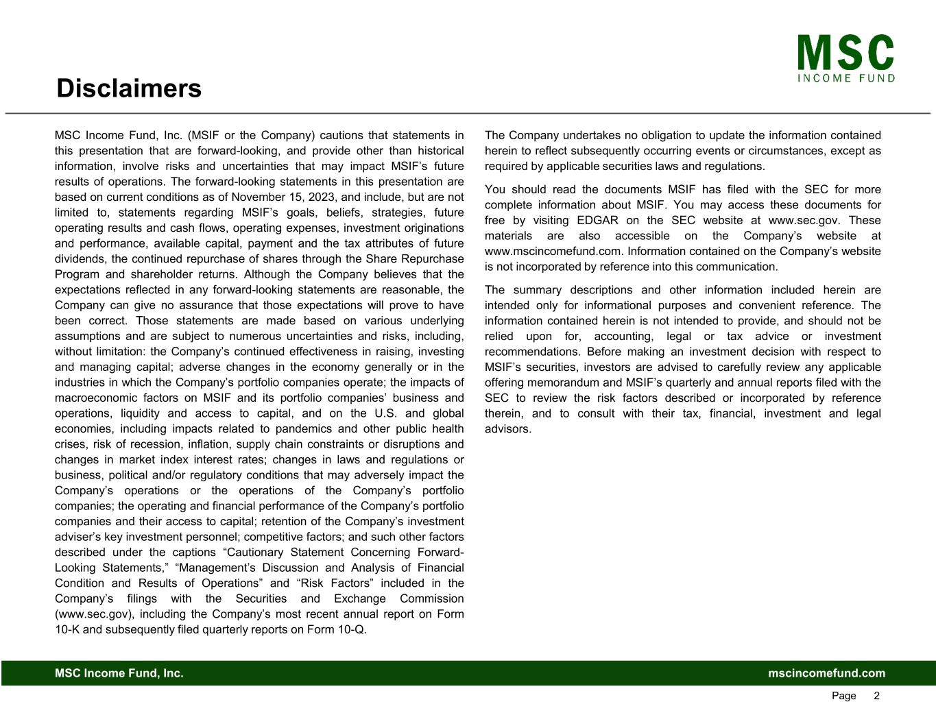 mscincomefund.comMSC Income Fund, Inc. Page 2 Disclaimers MSC Income Fund, Inc. (MSIF or the Company) cautions that statements in this presentation that are forward-looking, and provide other than historical information, involve risks and uncertainties that may impact MSIF’s future results of operations. The forward-looking statements in this presentation are based on current conditions as of November 15, 2023, and include, but are not limited to, statements regarding MSIF’s goals, beliefs, strategies, future operating results and cash flows, operating expenses, investment originations and performance, available capital, payment and the tax attributes of future dividends, the continued repurchase of shares through the Share Repurchase Program and shareholder returns. Although the Company believes that the expectations reflected in any forward-looking statements are reasonable, the Company can give no assurance that those expectations will prove to have been correct. Those statements are made based on various underlying assumptions and are subject to numerous uncertainties and risks, including, without limitation: the Company’s continued effectiveness in raising, investing and managing capital; adverse changes in the economy generally or in the industries in which the Company’s portfolio companies operate; the impacts of macroeconomic factors on MSIF and its portfolio companies’ business and operations, liquidity and access to capital, and on the U.S. and global economies, including impacts related to pandemics and other public health crises, risk of recession, inflation, supply chain constraints or disruptions and changes in market index interest rates; changes in laws and regulations or business, political and/or regulatory conditions that may adversely impact the Company’s operations or the operations of the Company’s portfolio companies; the operating and financial performance of the Company’s portfolio companies and their access to capital; retention of the Company’s investment adviser’s key investment personnel; competitive factors; and such other factors described under the captions “Cautionary Statement Concerning Forward- Looking Statements,” “Management’s Discussion and Analysis of Financial Condition and Results of Operations” and “Risk Factors” included in the Company’s filings with the Securities and Exchange Commission (www.sec.gov), including the Company’s most recent annual report on Form 10-K and subsequently filed quarterly reports on Form 10-Q. The Company undertakes no obligation to update the information contained herein to reflect subsequently occurring events or circumstances, except as required by applicable securities laws and regulations. You should read the documents MSIF has filed with the SEC for more complete information about MSIF. You may access these documents for free by visiting EDGAR on the SEC website at www.sec.gov. These materials are also accessible on the Company’s website at www.mscincomefund.com. Information contained on the Company’s website is not incorporated by reference into this communication. The summary descriptions and other information included herein are intended only for informational purposes and convenient reference. The information contained herein is not intended to provide, and should not be relied upon for, accounting, legal or tax advice or investment recommendations. Before making an investment decision with respect to MSIF’s securities, investors are advised to carefully review any applicable offering memorandum and MSIF’s quarterly and annual reports filed with the SEC to review the risk factors described or incorporated by reference therein, and to consult with their tax, financial, investment and legal advisors.