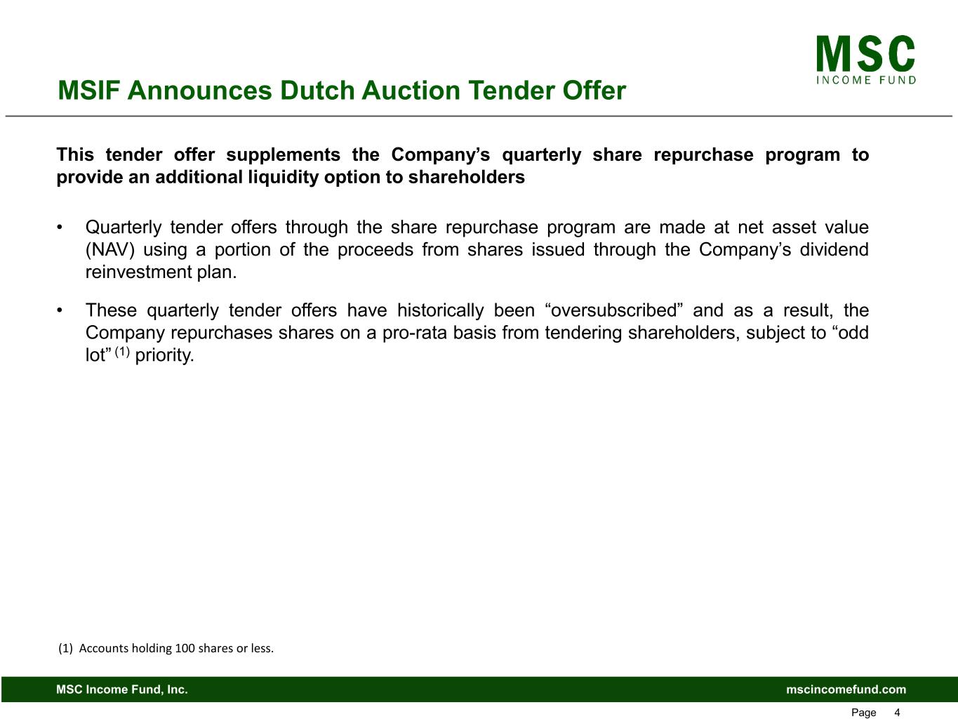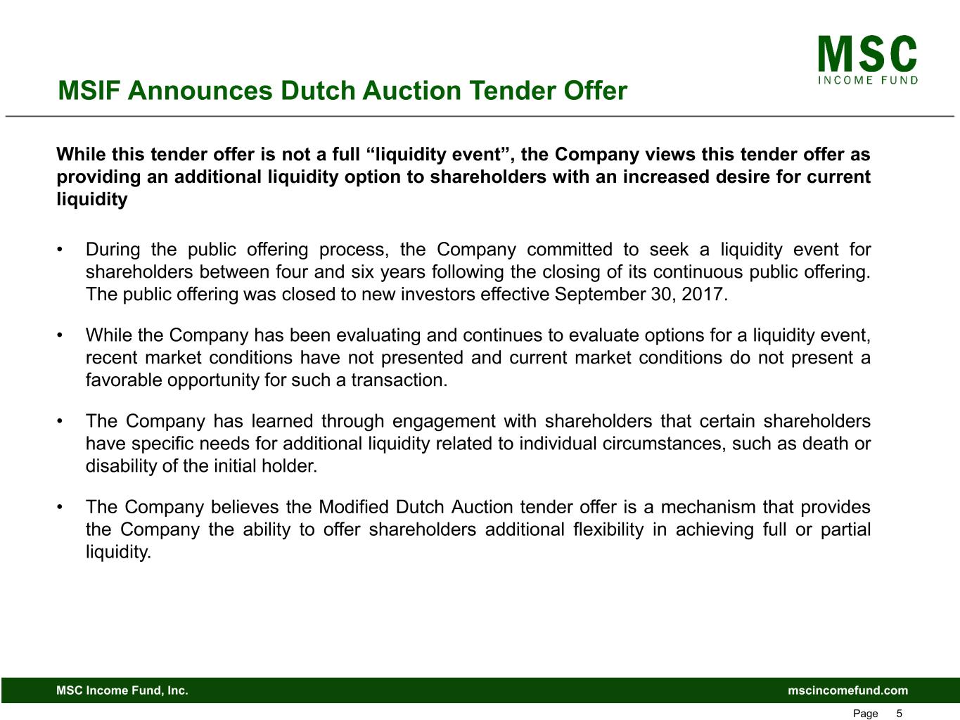 mscincomefund.comMSC Income Fund, Inc. Page 4 MSIF Announces Dutch Auction Tender Offer This tender offer supplements the Company’s quarterly share repurchase program to provide an additional liquidity option to shareholders • Quarterly tender offers through the share repurchase program are made at net asset value (NAV) using a portion of the proceeds from shares issued through the Company’s dividend reinvestment plan. • These quarterly tender offers have historically been “oversubscribed” and as a result, the Company repurchases shares on a pro-rata basis from tendering shareholders, subject to “odd lot” (1) priority. (1) Accounts holding 100 shares or less.