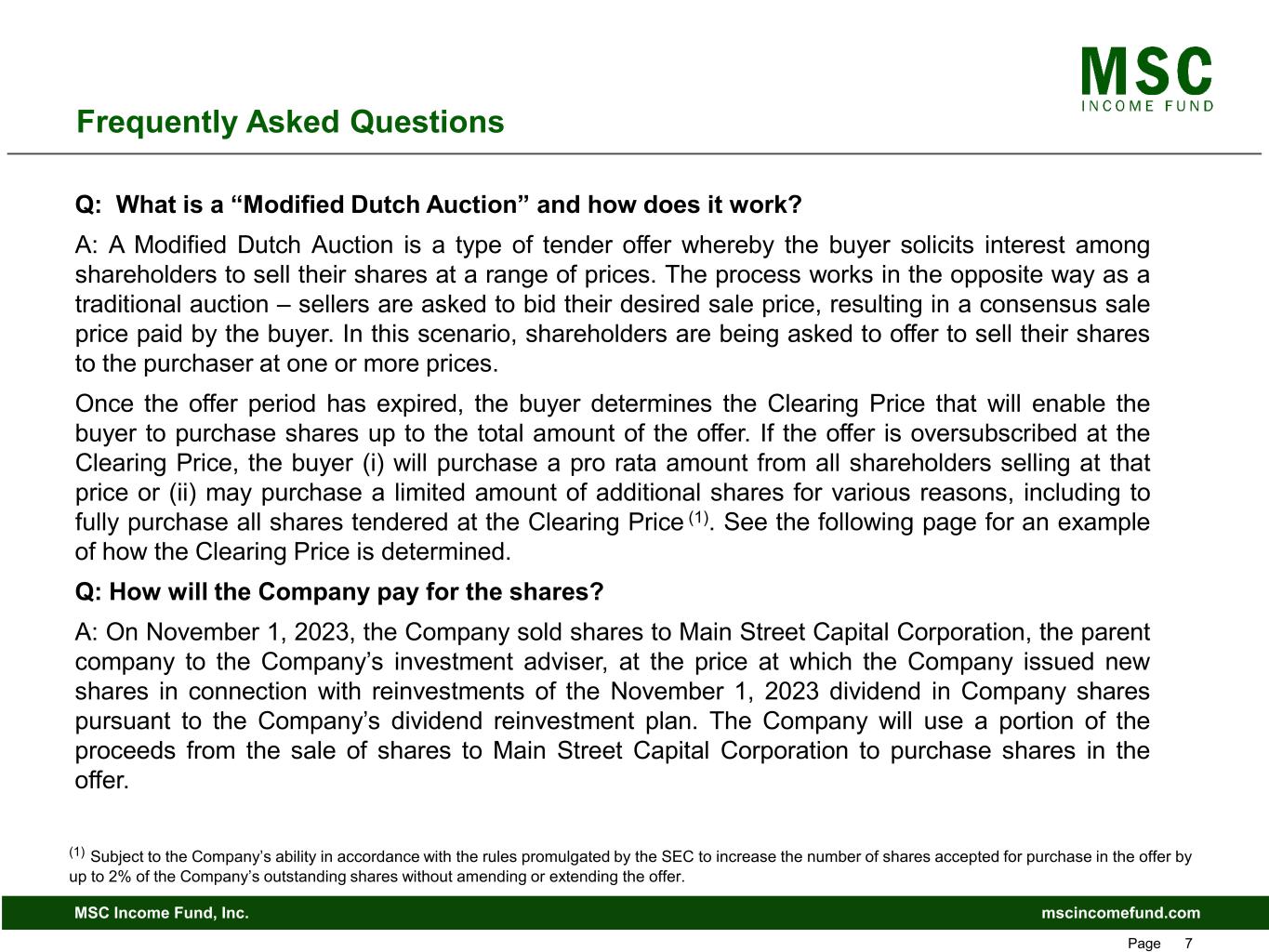 mscincomefund.comMSC Income Fund, Inc. Page 7 Frequently Asked Questions Q: What is a “Modified Dutch Auction” and how does it work? A: A Modified Dutch Auction is a type of tender offer whereby the buyer solicits interest among shareholders to sell their shares at a range of prices. The process works in the opposite way as a traditional auction – sellers are asked to bid their desired sale price, resulting in a consensus sale price paid by the buyer. In this scenario, shareholders are being asked to offer to sell their shares to the purchaser at one or more prices. Once the offer period has expired, the buyer determines the Clearing Price that will enable the buyer to purchase shares up to the total amount of the offer. If the offer is oversubscribed at the Clearing Price, the buyer (i) will purchase a pro rata amount from all shareholders selling at that price or (ii) may purchase a limited amount of additional shares for various reasons, including to fully purchase all shares tendered at the Clearing Price (1). See the following page for an example of how the Clearing Price is determined. Q: How will the Company pay for the shares? A: On November 1, 2023, the Company sold shares to Main Street Capital Corporation, the parent company to the Company’s investment adviser, at the price at which the Company issued new shares in connection with reinvestments of the November 1, 2023 dividend in Company shares pursuant to the Company’s dividend reinvestment plan. The Company will use a portion of the proceeds from the sale of shares to Main Street Capital Corporation to purchase shares in the offer. (1) Subject to the Company’s ability in accordance with the rules promulgated by the SEC to increase the number of shares accepted for purchase in the offer by up to 2% of the Company’s outstanding shares without amending or extending the offer.