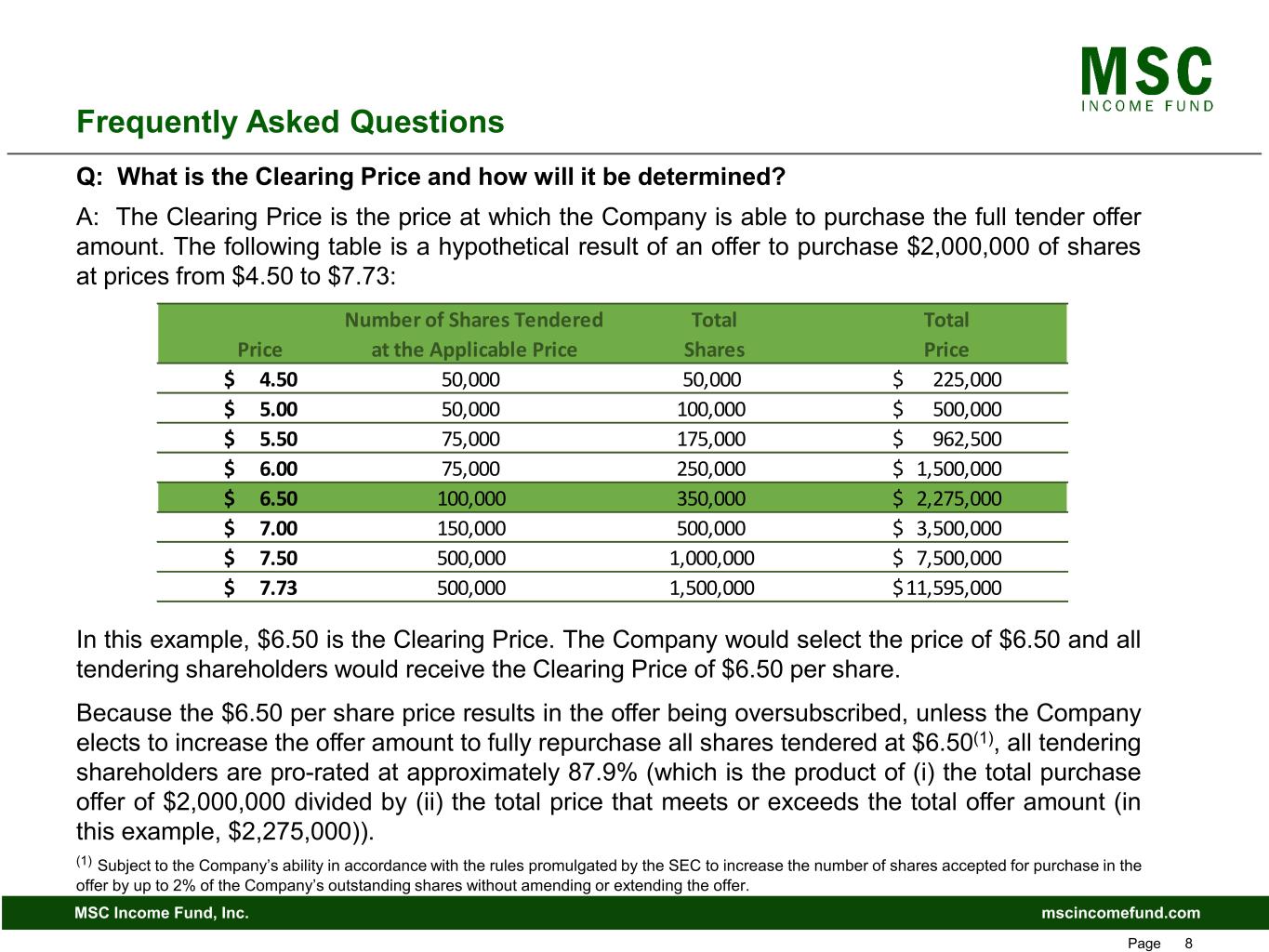 mscincomefund.comMSC Income Fund, Inc. Page 8 Frequently Asked Questions Q: What is the Clearing Price and how will it be determined? A: The Clearing Price is the price at which the Company is able to purchase the full tender offer amount. The following table is a hypothetical result of an offer to purchase $2,000,000 of shares at prices from $4.50 to $7.73: In this example, $6.50 is the Clearing Price. The Company would select the price of $6.50 and all tendering shareholders would receive the Clearing Price of $6.50 per share. Because the $6.50 per share price results in the offer being oversubscribed, unless the Company elects to increase the offer amount to fully repurchase all shares tendered at $6.50(1), all tendering shareholders are pro-rated at approximately 87.9% (which is the product of (i) the total purchase offer of $2,000,000 divided by (ii) the total price that meets or exceeds the total offer amount (in this example, $2,275,000)). (1) Subject to the Company’s ability in accordance with the rules promulgated by the SEC to increase the number of shares accepted for purchase in the offer by up to 2% of the Company’s outstanding shares without amending or extending the offer. Number of Shares Tendered Total Total Price at the Applicable Price Shares Price 4.50$ 50,000 50,000 225,000$ 5.00$ 50,000 100,000 500,000$ 5.50$ 75,000 175,000 962,500$ 6.00$ 75,000 250,000 1,500,000$ 6.50$ 100,000 350,000 2,275,000$ 7.00$ 150,000 500,000 3,500,000$ 7.50$ 500,000 1,000,000 7,500,000$ 7.73$ 500,000 1,500,000 11,595,000$