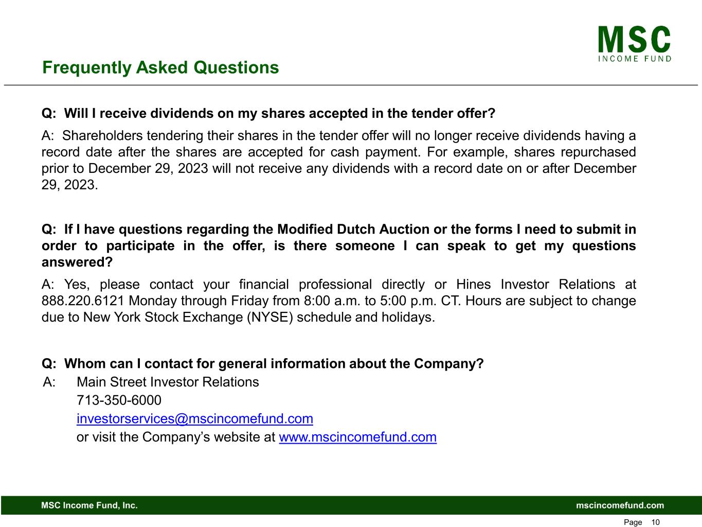 mscincomefund.comMSC Income Fund, Inc. Page 10 Frequently Asked Questions Q: Will I receive dividends on my shares accepted in the tender offer? A: Shareholders tendering their shares in the tender offer will no longer receive dividends having a record date after the shares are accepted for cash payment. For example, shares repurchased prior to December 29, 2023 will not receive any dividends with a record date on or after December 29, 2023. Q: If I have questions regarding the Modified Dutch Auction or the forms I need to submit in order to participate in the offer, is there someone I can speak to get my questions answered? A: Yes, please contact your financial professional directly or Hines Investor Relations at 888.220.6121 Monday through Friday from 8:00 a.m. to 5:00 p.m. CT. Hours are subject to change due to New York Stock Exchange (NYSE) schedule and holidays. Q: Whom can I contact for general information about the Company? A: Main Street Investor Relations 713-350-6000 investorservices@mscincomefund.com or visit the Company’s website at www.mscincomefund.com